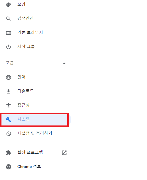 ✓ 우선, 아까 들어오셨던 크롬 설정 화면 왼쪽에서, 이번에는 아래 보이시는 고급 버튼을 누른 뒤, 시스템을 눌러 들어와 주시면 됩니다.