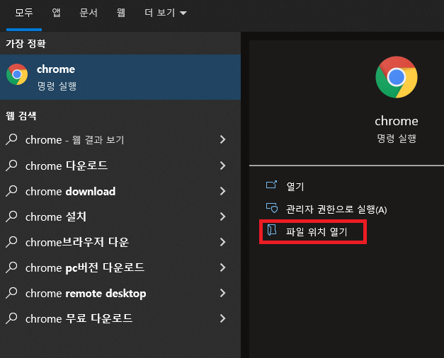 ✓ 마지막으로 설명드릴 방법은 바로, 크롬 브라우저 바로 가기의 설정을 변경하는 것입니다. 이를 위해, 우선 검색창에 Chrome이라고 검색하신 후, 오른쪽에 보이시는, 파일 위치 열기를 선택해줍니다.