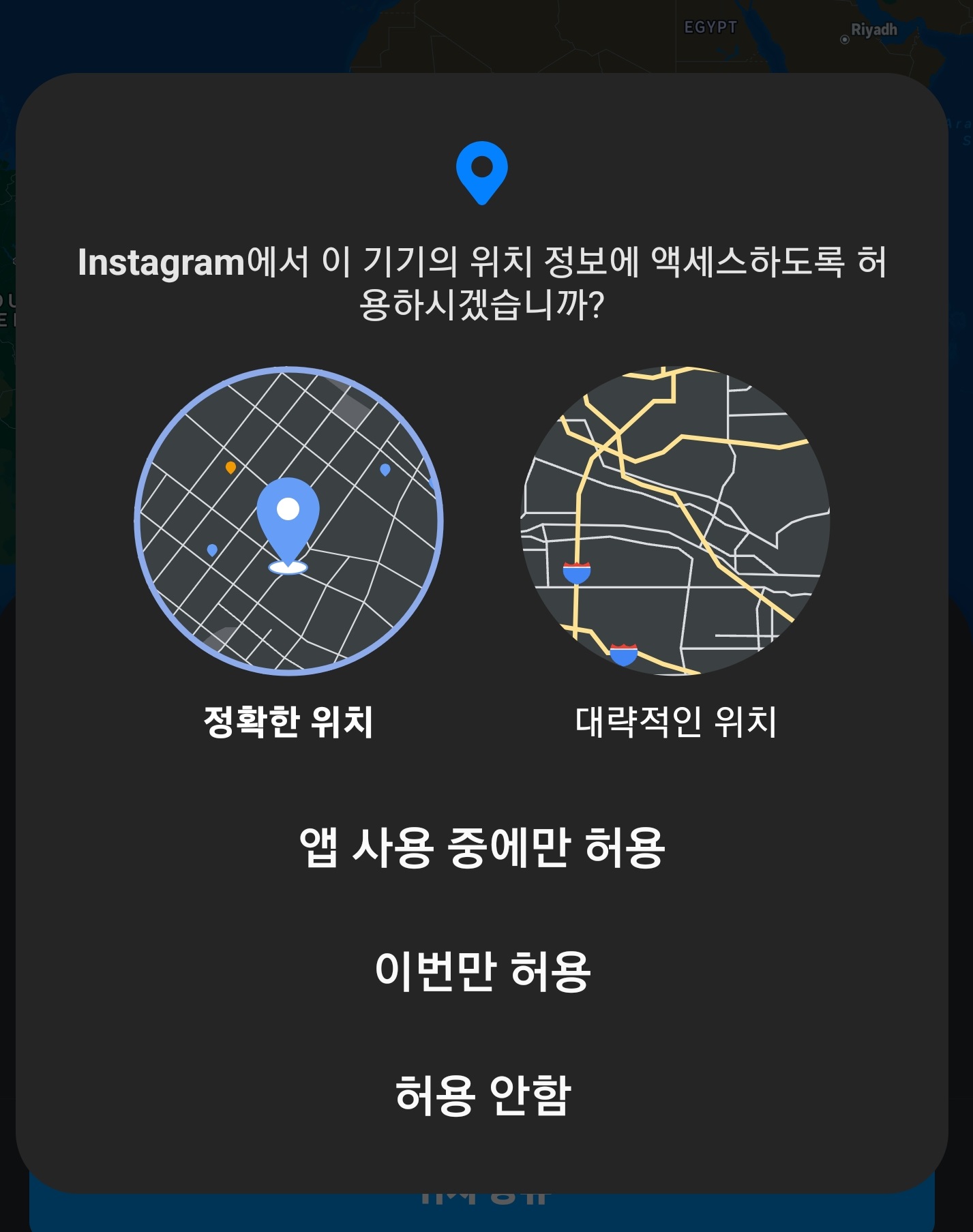 만일, 위치 정보가 꺼져있다면, 이번만 허용 혹은 앱 사용 중에만 허용 버튼을 눌러, 허용해 주시면 됩니다.