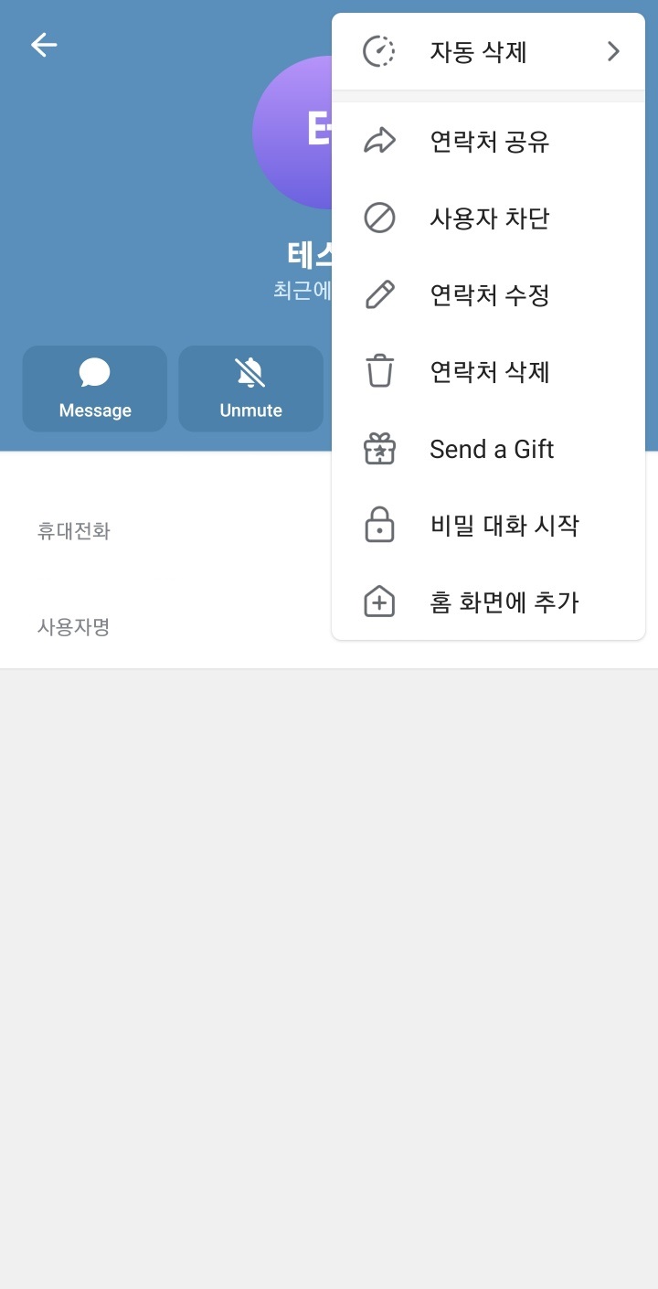 만일 상대방의 텔레그램 계정을 삭제하고 싶으시다면, 계정을 눌러, 연락처 삭제를 눌러주시면 됩니다.