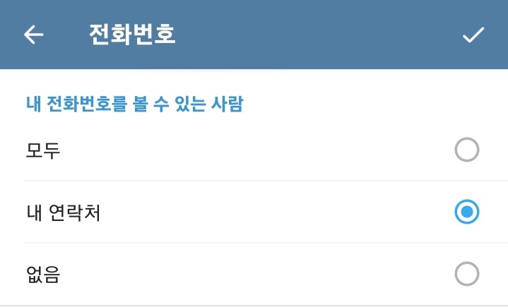 만일, 이 전화번호 항목에서, 내 전화번호를 볼 수 있는 사람을 "없음"으로 설정하셨다면, 누군가가 연락처로 친구추가하는 것이 불가능합니다.