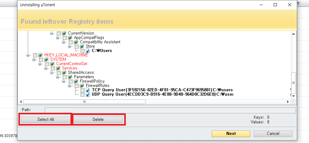 ✓ 스캔을 누르게 되면, 파일이나 프로그램 등을 삭제하고, 남은 찌꺼기 파일들이 나타나는 것을 알 수 있는데요, 이 파일을 모두 삭제하시려면, 왼쪽에 있는 Select All을 누르시고, Delete 버튼을 눌러주시면 됩니다. 그런 다음, 나오는 삭제 확인 화면에서 예를 선택해주시면 됩니다.