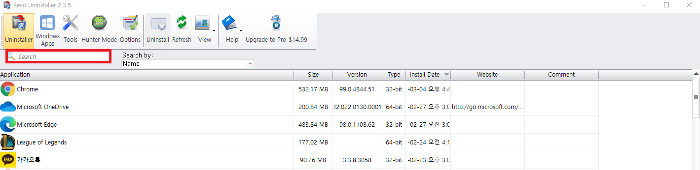 ✓ 레보 언인스톨러를 설치하신 후, 실행하게 되면, 위처럼 본인이 컴퓨터에 설치한 다양한 프로그램이 나타나게 되는 것을 알 수 있는데요, 여기서 삭제할 프로그램이나 파일 등을 스크롤을 통해 찾으셔도 되고, 왼쪽 위에 보이시는 Search 버튼을 통해, 검색을 해주셔도 됩니다.