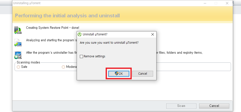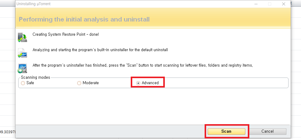 ✓ 프로그램 자체의 언인스톨이 끝났다면, 위처럼 스캐닝 모드가 활성화되는데요, 여기서 프로그램의 각종 찌꺼기 파일을 남김없이 삭제하고 싶으시다면, 아래에 있는 세 가지 항목 중 어드밴스드를 선택하신 뒤, Scan을 눌러줍니다.