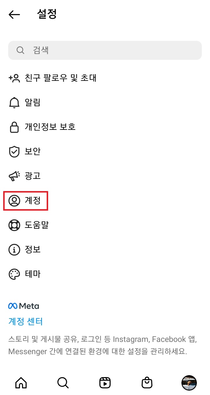 ✓ 설정을 눌러 들어오게 되면, 위처럼 친구 팔로우 및 초대 등과 같은 여러 가지 항목이 나열되는 것을 알 수 있는데요, 여기서 계정을 눌러 들어가 줍니다.