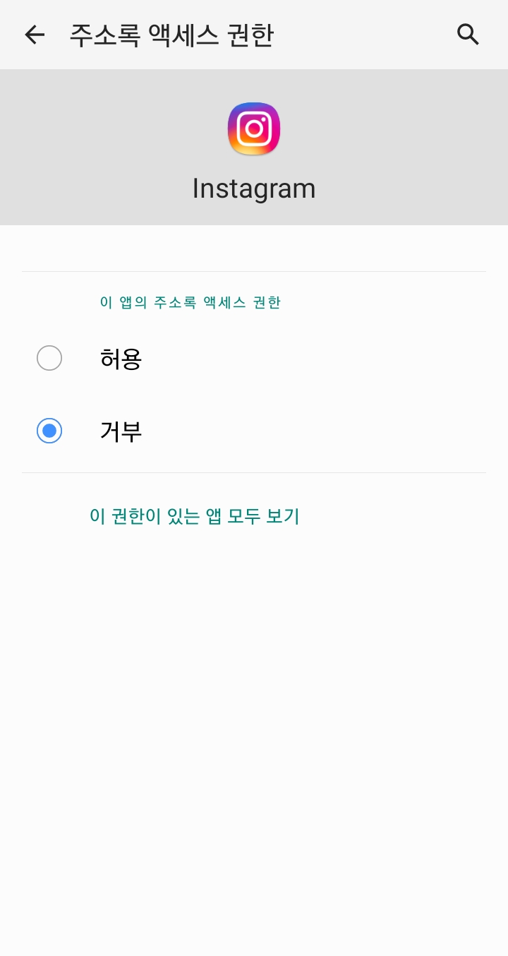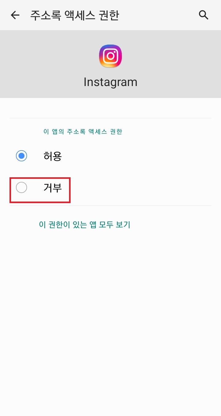✓ 주소록을 누르게 되면, 인스타그램에서 주소록 액세스 권한을 설정하는 화면이 나타나게 되는데요, 여기서 이 앱의 주소록 액세스 권한을 허용에서 거부로 변경해주시면 됩니다.