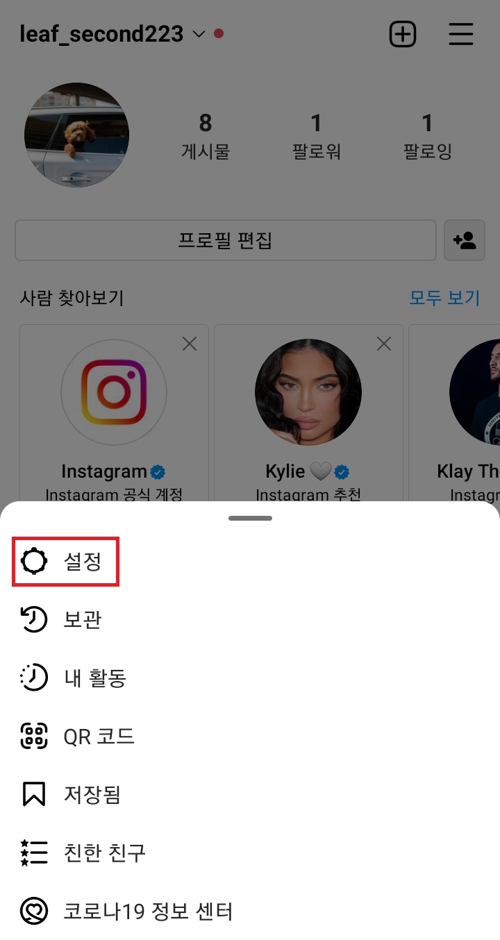 ✓ 줄 3개 버튼을 눌러주시게 되면, 설정과 보관, 내 활동 등의 여러 가지 항목이 나타나는 것을 알 수 있는데요, 여기서 처음에 보이시는 설정을 눌러줍니다.