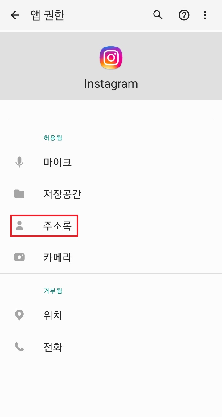 ✓ 권한을 눌러 들어가게 되면, 인스타그램 앱 권한 화면이 나타나게 되는데요, 여기서 주소록을 눌러 들어가 주시면 됩니다.
