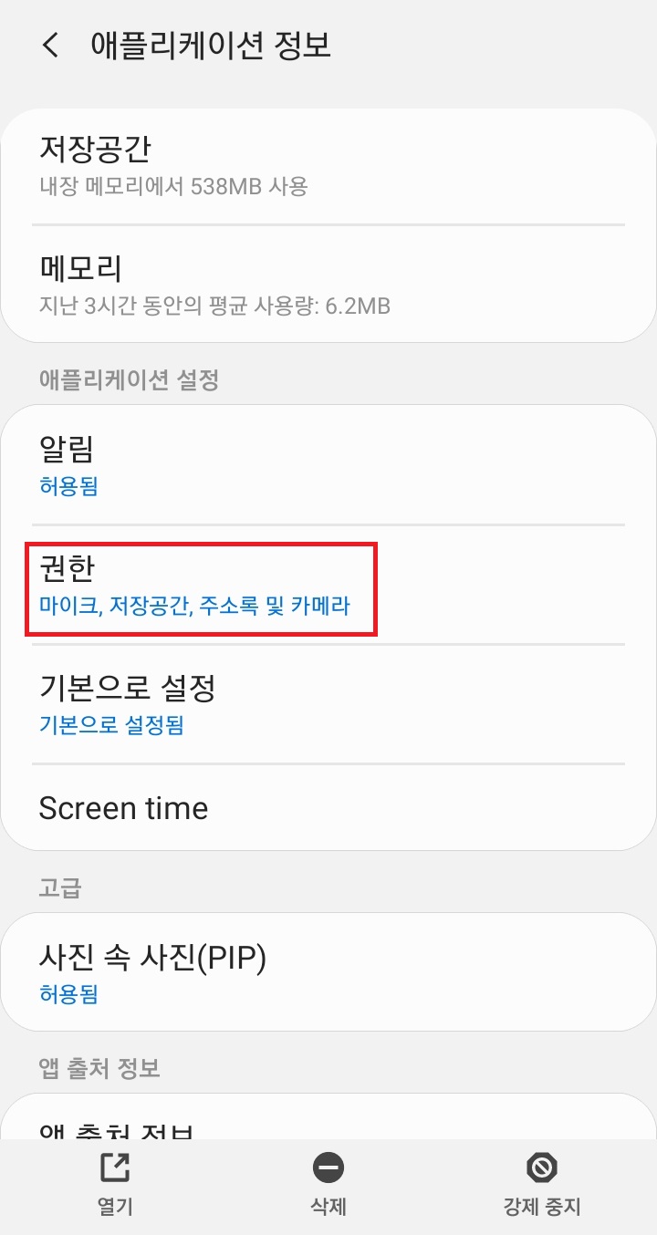 ✓ 앱 정보를 눌러 들어가게 되면, 위처럼 다양한 애플리케이션 정보가 나타나는 것을 알 수 있는데요, 여기서 중간에 보이시는 애플리케이션 설정에, 권한을 눌러 들어가 줍니다.