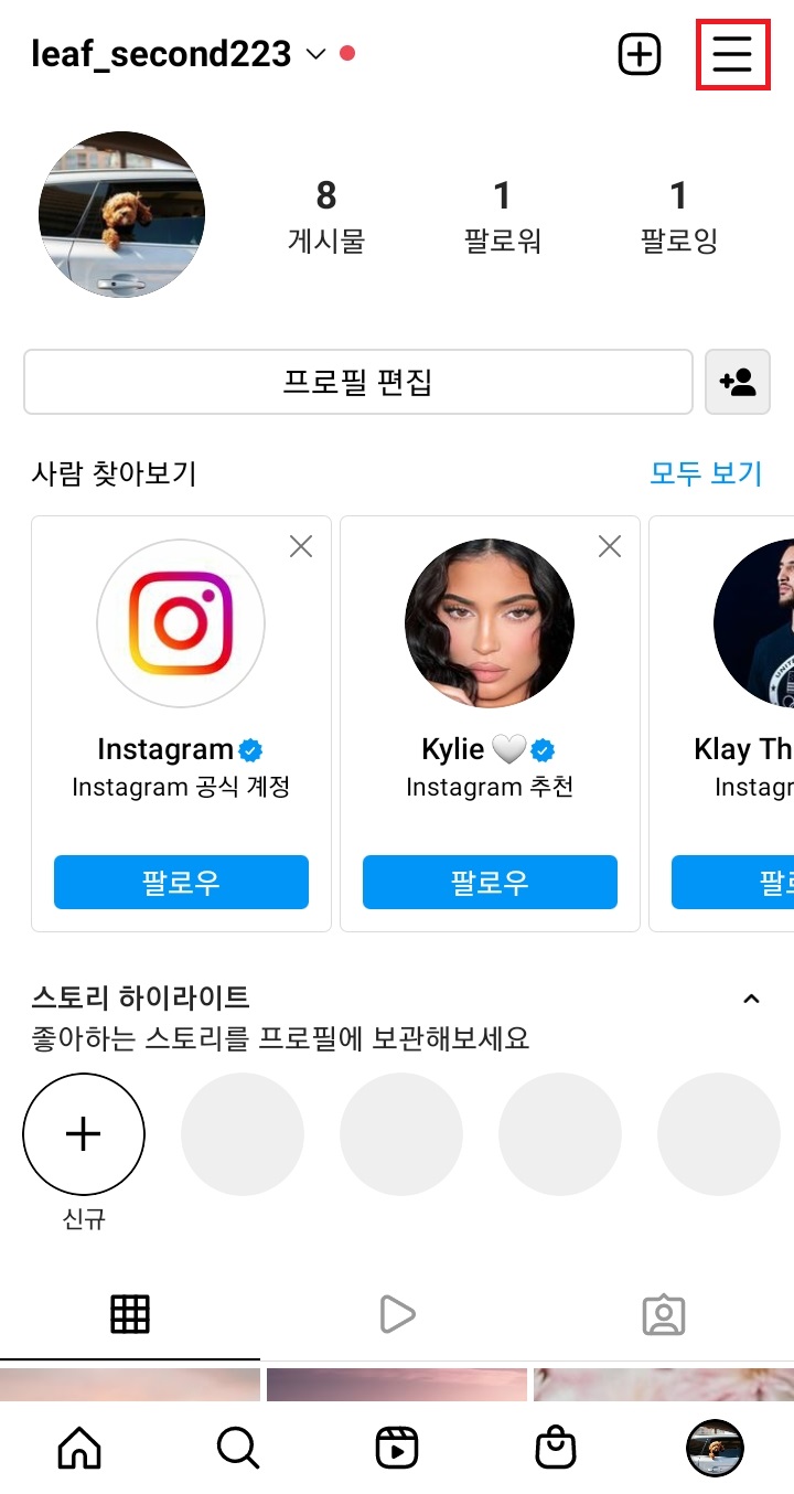 ✓ 우선, 인스타그램 앱에서 본인의 인스타그램 프로필 화면으로 들어오신 후, 우측 상단에 보이시는, 줄 3개 버튼을 눌러줍니다.