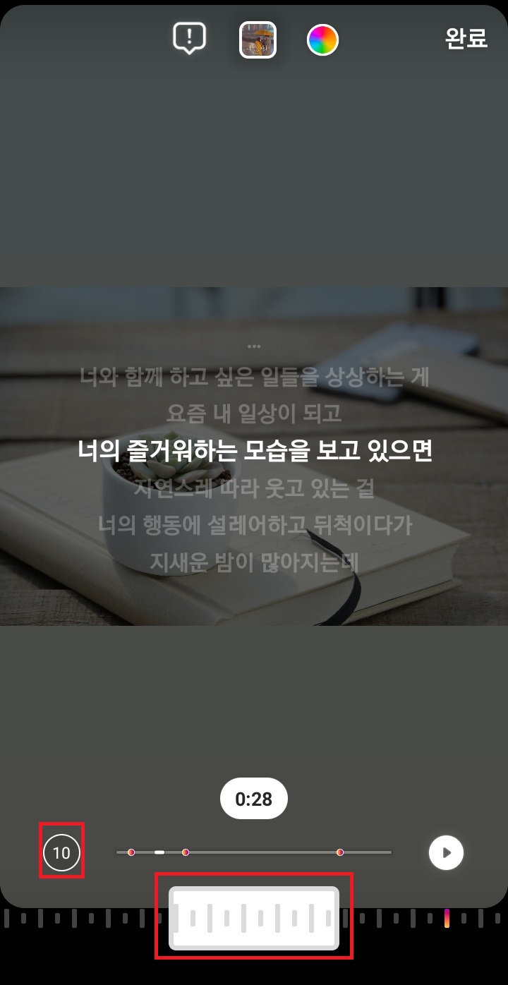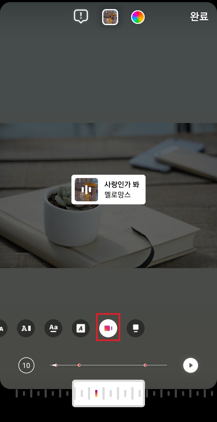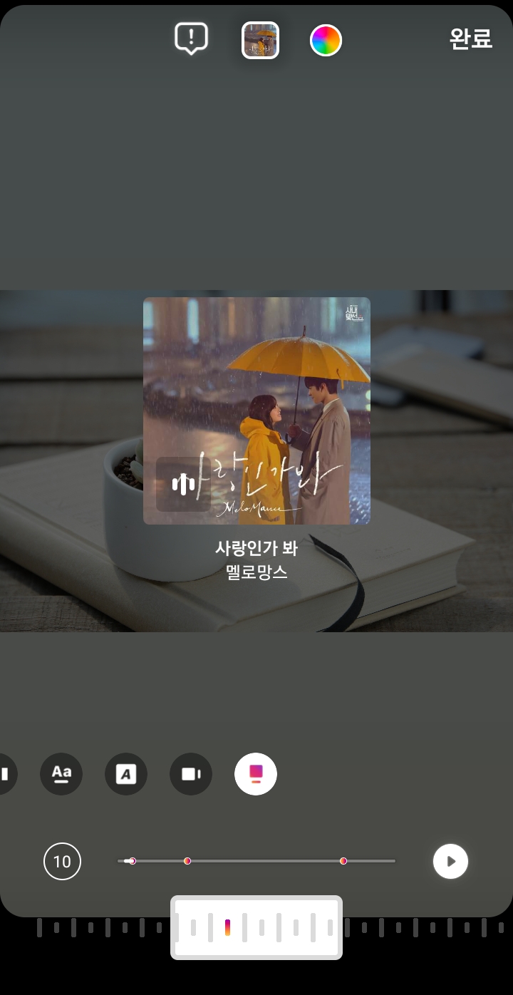 ✓ 완료 버튼을 누르게 되면, 위처럼 재생 시간이 15초에서 10초로 변경된 것을 알 수 있습니다. 그리고 만일, 노래가 나오는 부분을 후렴이 아닌 다른 곳으로 변경하고 싶으시다면, 아래 재생 바를 좌우로 움직여줍니다.