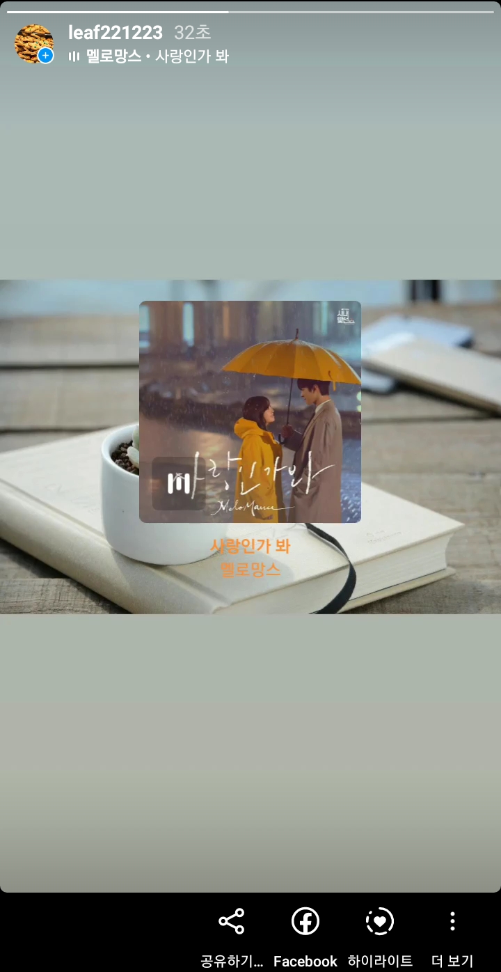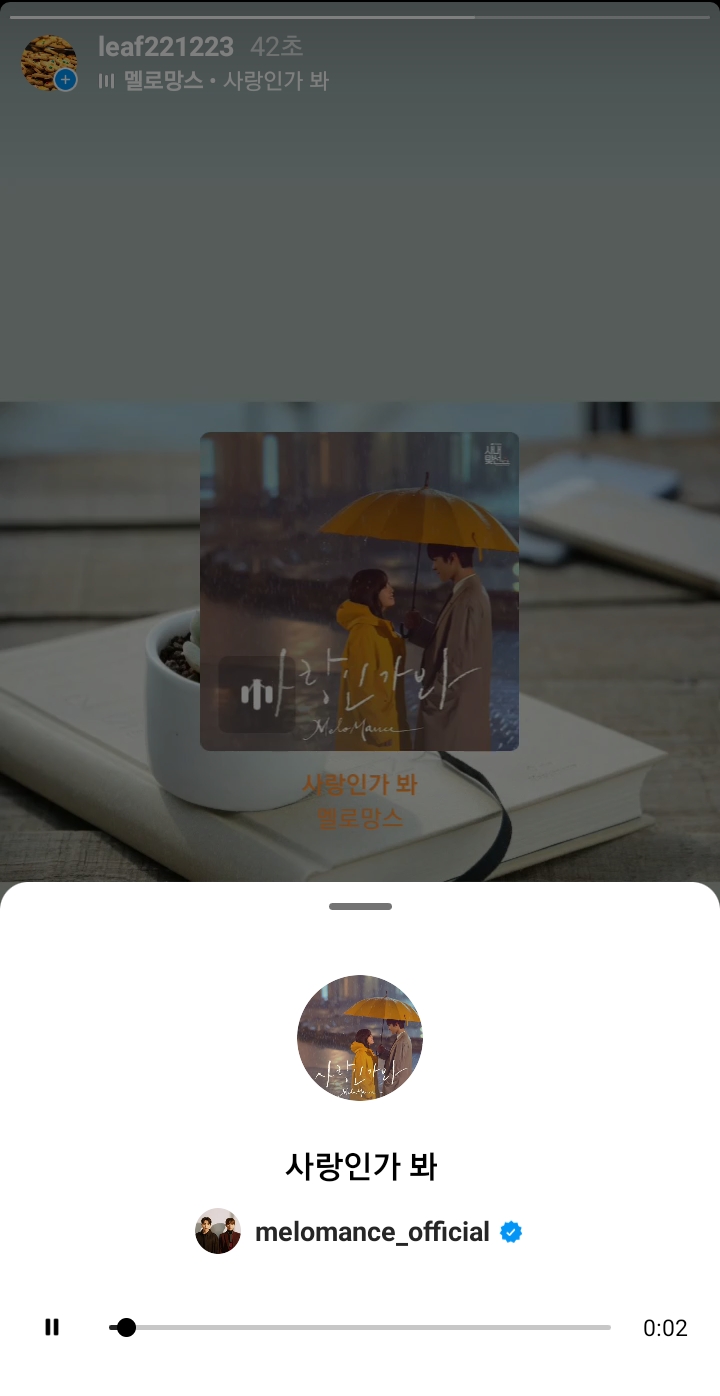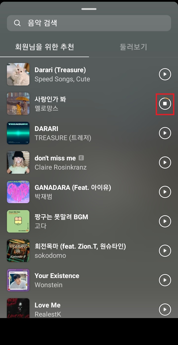 ✓ 위 곡을 누르게 되면, 본인이 선택한 노래의 후렴 부분이 나오면서, 스토리 중앙에 가사가 표시되는 것을 알 수 있습니다.