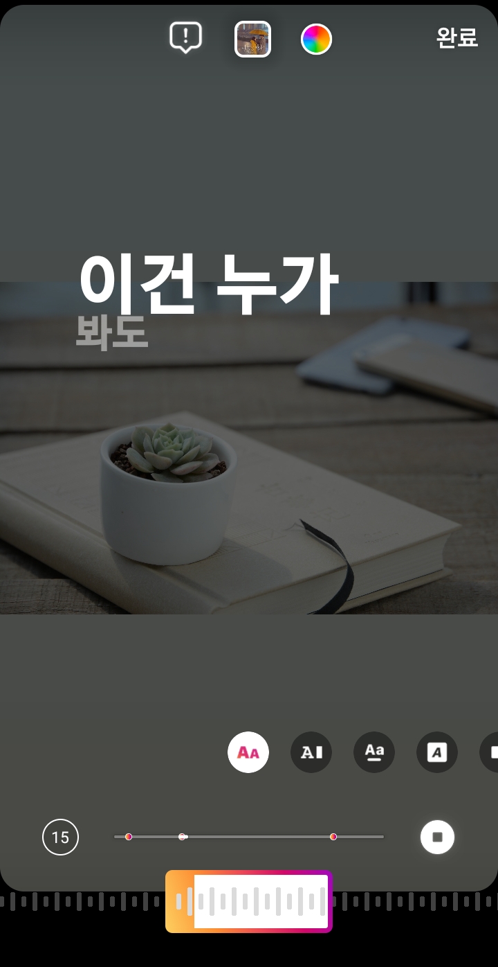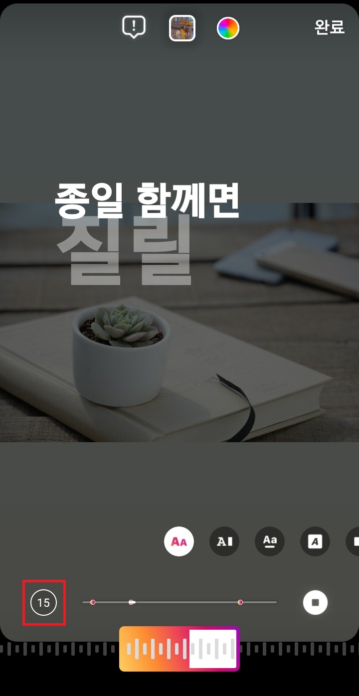 ✓ 만일, 여기서 스토리에 재생될 음악의 재생 시간을 변경하시고 싶다면, 좌측 하단에 있는 15 표시를 눌러 들어가 주시면 됩니다.