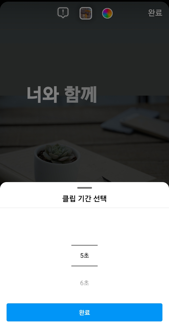 ✓ 15 표시를 눌러주시게 되면, 위처럼 클립 기간 선택이라는 항목이 나오게 되는데요, 여기서 최소 5초, 최대 15초로 재생 시간을 설정하실 수 있습니다. 설정이 끝났다면 아래 완료 버튼을 눌러 나와주시면 됩니다.