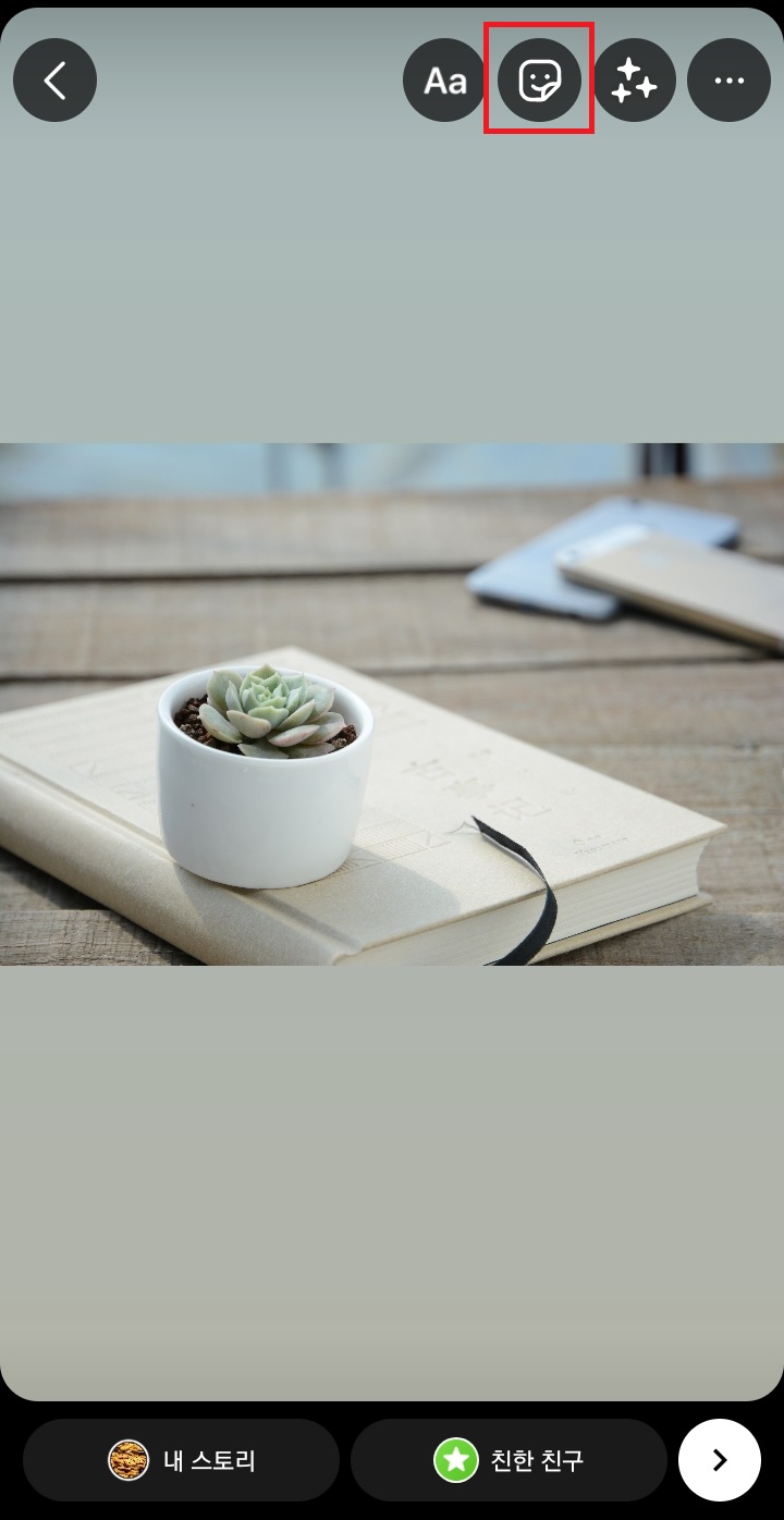 ✓ 내 스토리를 누른 뒤 직접 사진을 찍거나, 위처럼 본인의 갤러리에서 적절한 사진 하나를 골라준 뒤, 상단에 보이시는 스티커 아이콘을 눌러줍니다.
