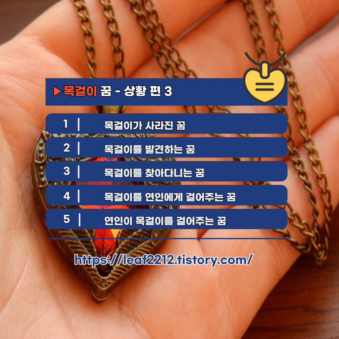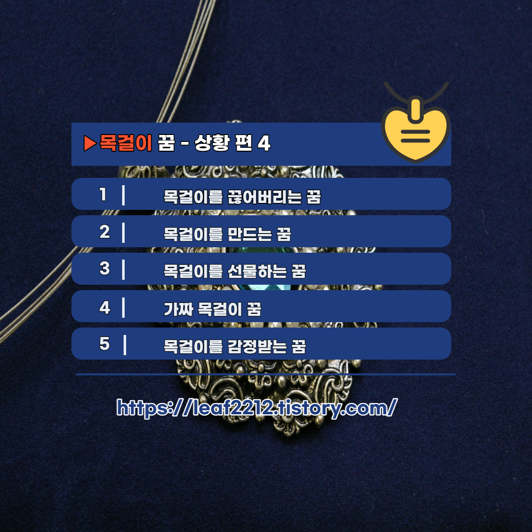 목걸이 꿈을 꾸더라도, 목걸이와 관련하여 어떠한 행동, 상황, 환경 등이 생겨났는지에 따라 해몽이 달라질 수 있습니다. 다음으로, 목걸이 꿈 - 상황 편 1에 대해 알아보도록 하겠습니다.
