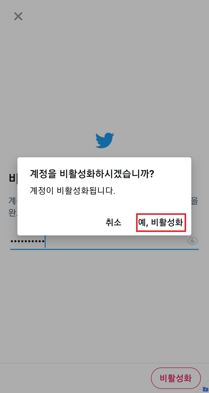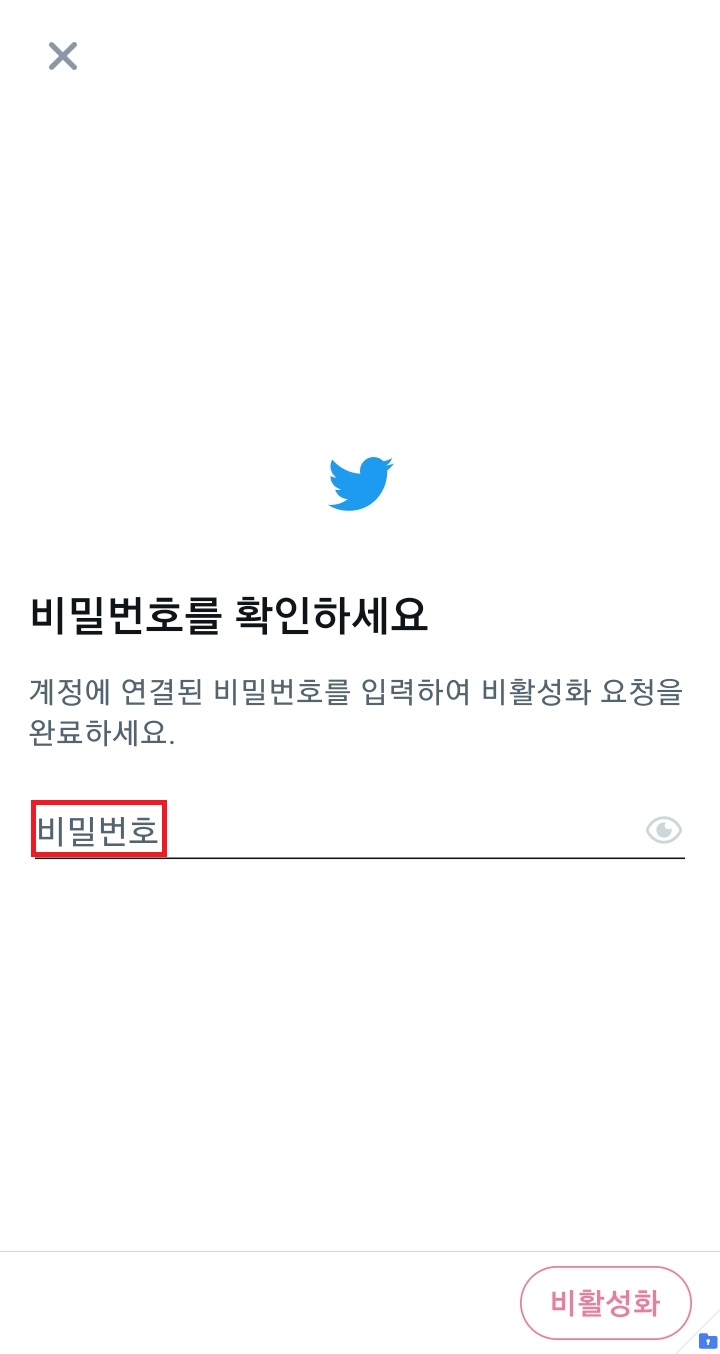 ✓ 아래 비활성화 버튼을 누르게 되면, 위처럼 비밀번호를 입력하라는 화면이 나오게 되는데요, 여기서 본인의 트위터 계정의 비밀번호를 정확하게 입력하신 후, 아래 비활성화 버튼을 눌러주시면 됩니다.