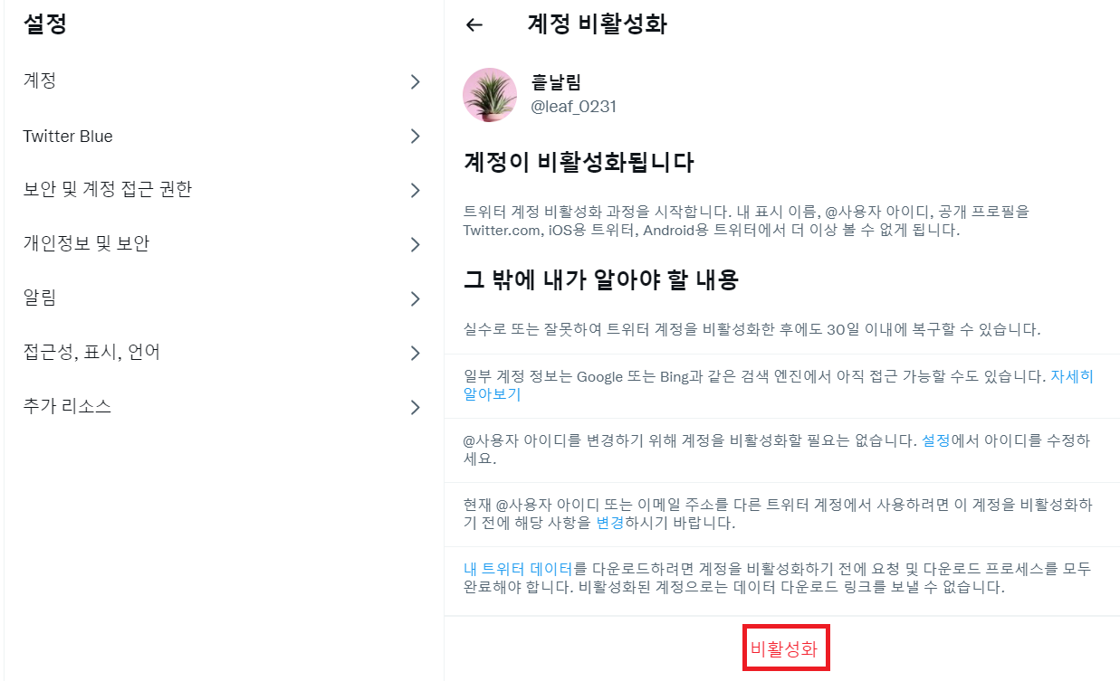 트위터 계정 비활성화 방법은?