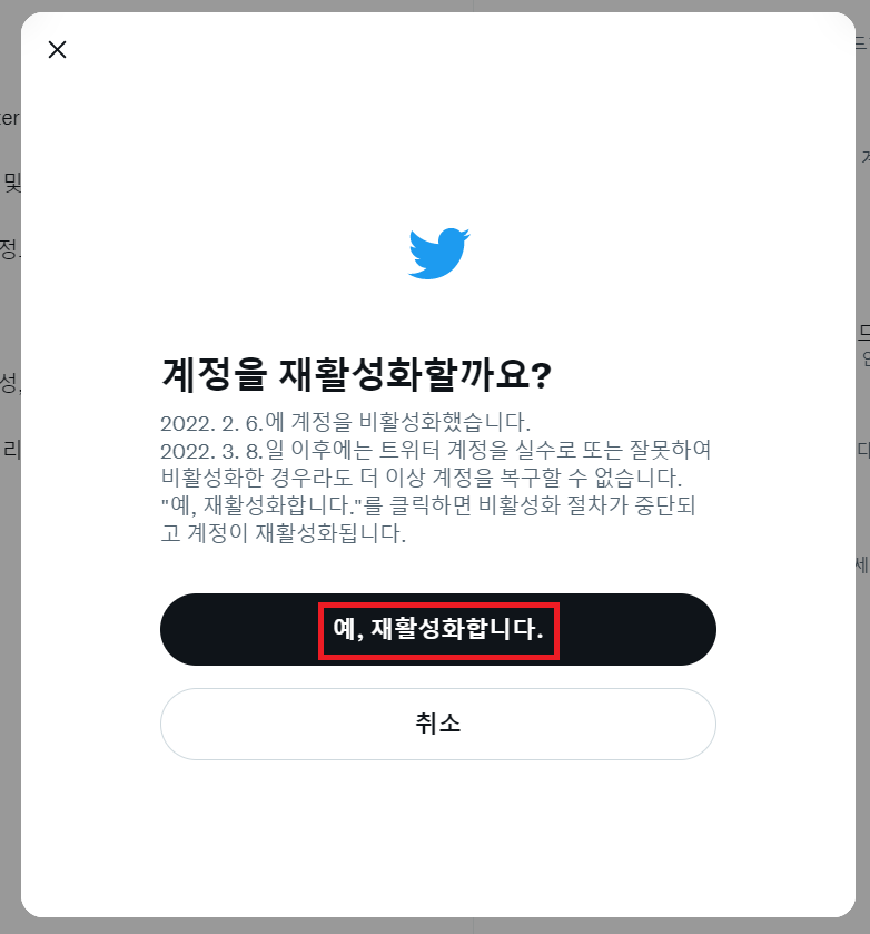 ✓ 만일, 비활성화를 한 뒤, 30일이 지나도 로그인을 하지 않았다면, 계정이 자동으로 삭제되며, 30일이 지나기 이전에 로그인을 하게 되면, 위처럼 계정 재활성화가 나타납니다. 여기서 재활성화 버튼을 누르게 되면, 위처럼 본인의 트위터 계정이 복구되는 것을 알 수 있습니다.