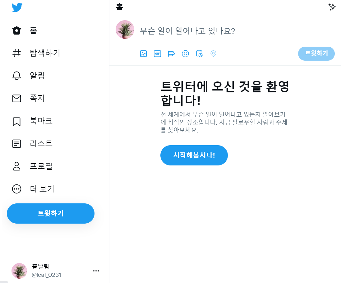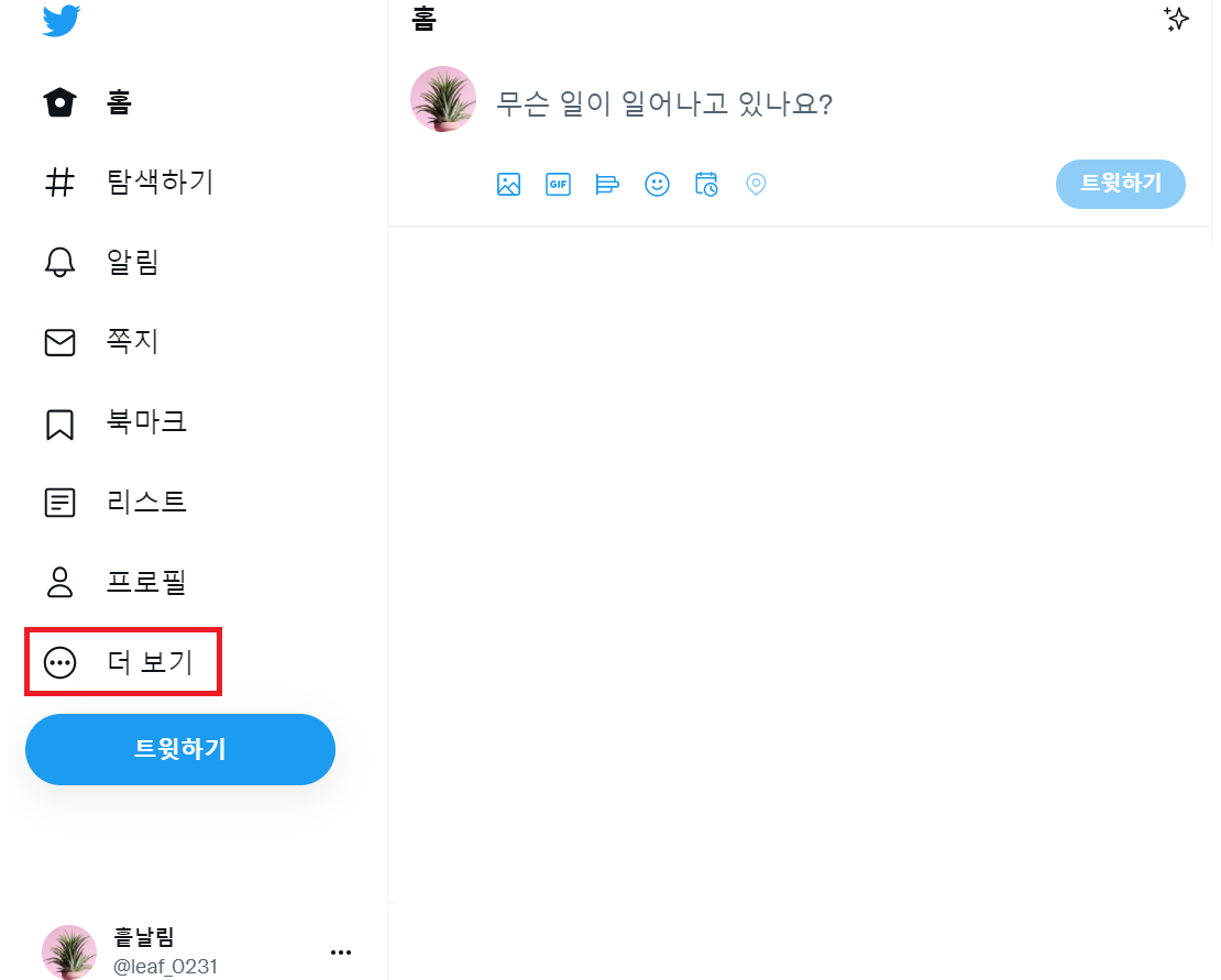 ✓ 우선, 계정을 비활성화하고 싶은 트위터 계정으로 로그인하시게 되면, 위와 같은 화면이 나타나는데요, 여기서 왼쪽에 보이시는 더 보기 버튼을 눌러줍니다.