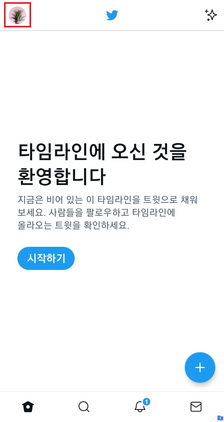 ✓ 우선, 트위터 모바일 앱을 실행시켜, 비활성화하고자 하는 트위터 아이디를 로그인하게 되면, 위와 같은 화면이 나타나는데요, 여기서 왼쪽 위에 보이시는 본인의 프로필을 눌러줍니다.