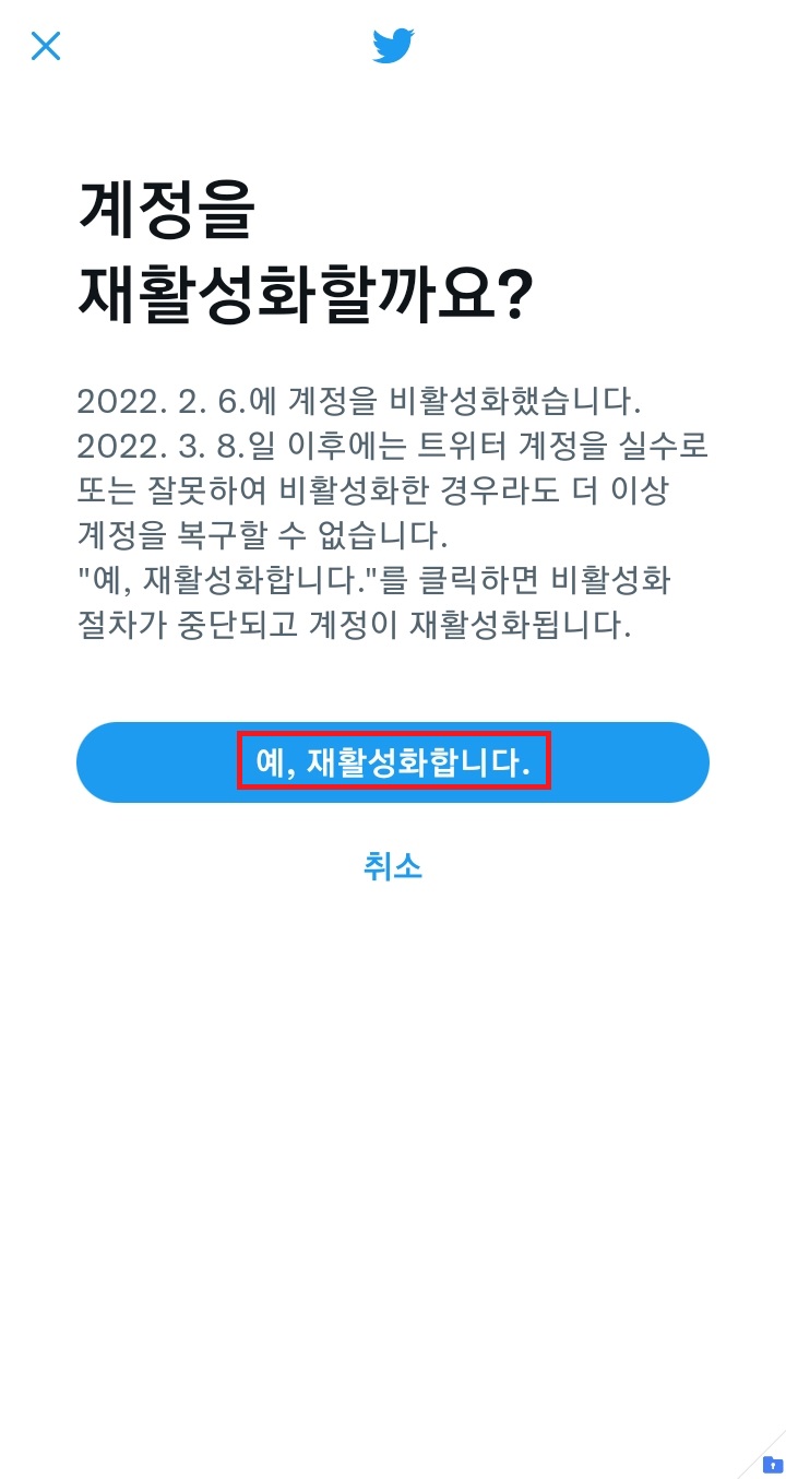 ✓ PC와 마찬가지로, 30일 이전에 비활성화한 트위터 계정으로 로그인을 하게 되면, 재활성화 문구가 나타나면서, 다시 트위터를 이용하실 수 있습니다.