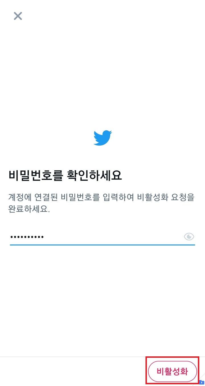 ✓ 아래 비활성화 버튼을 누르게 되면, 위처럼 비밀번호를 입력하라는 화면이 나오게 되는데요, 여기서 본인의 트위터 계정의 비밀번호를 정확하게 입력하신 후, 아래 비활성화 버튼을 눌러주시면 됩니다.