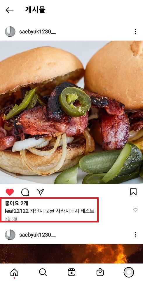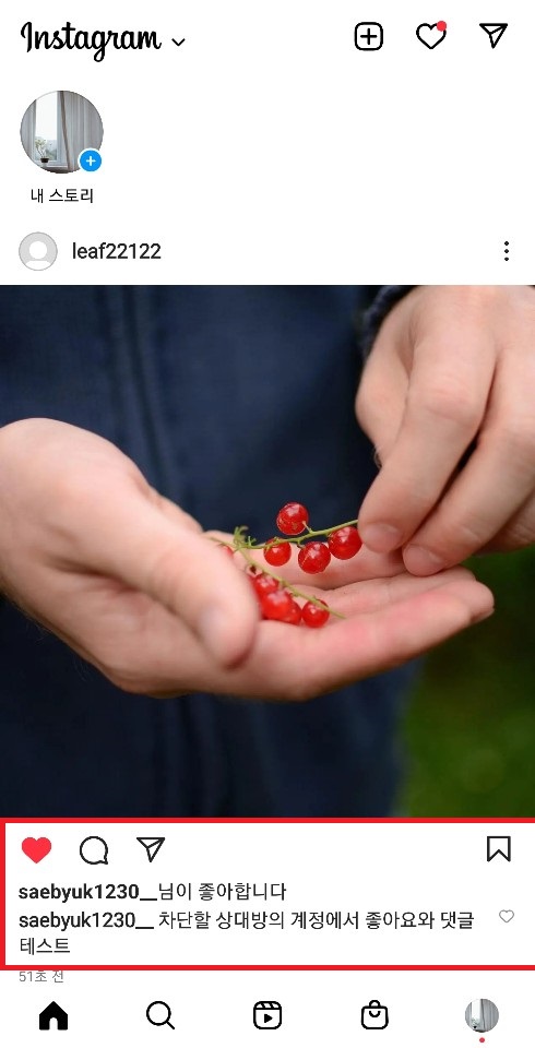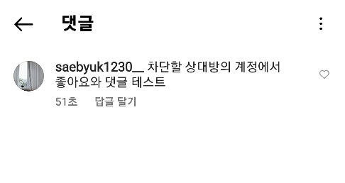 ✓ 그런 다음 반대로, 차단할 상대방의 계정에도 위와 같이 좋아요와 댓글을 남긴 후, 상대방을 차단하게 되면, 내가 남긴 좋아요와 댓글, 혹은 상대방이 남긴 좋아요와 댓글 상태는 어떠한지 알아보도록 하겠습니다.
